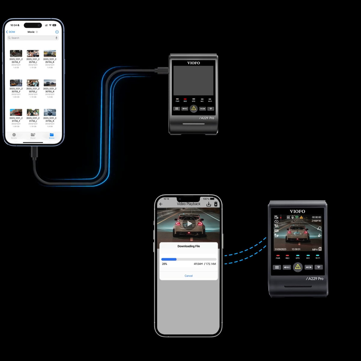 An upgraded 5GHz Wi-Fi connection module is built into A229 Pro to provide much faster Wi-Fi data transfer, ensuring smooth video previewing, downloading and sharing. The camera also supports wired connectivity to your smartphone via a USB Type-C to Type-C data cable, enabling fast downloads of photos and videos.